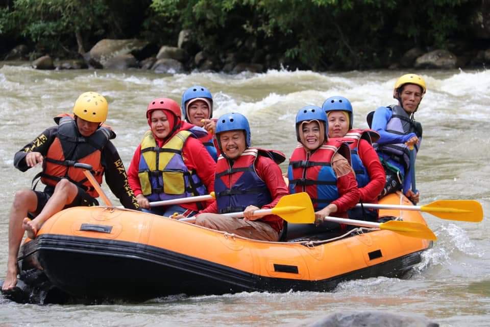 Istri orang nomor satu di Muara Enim bersama anggota PKK lainnya melakukan petualang dengan mengarungi derasnya air Sungai Enim tersebut, dengan menaiki perahu karet.