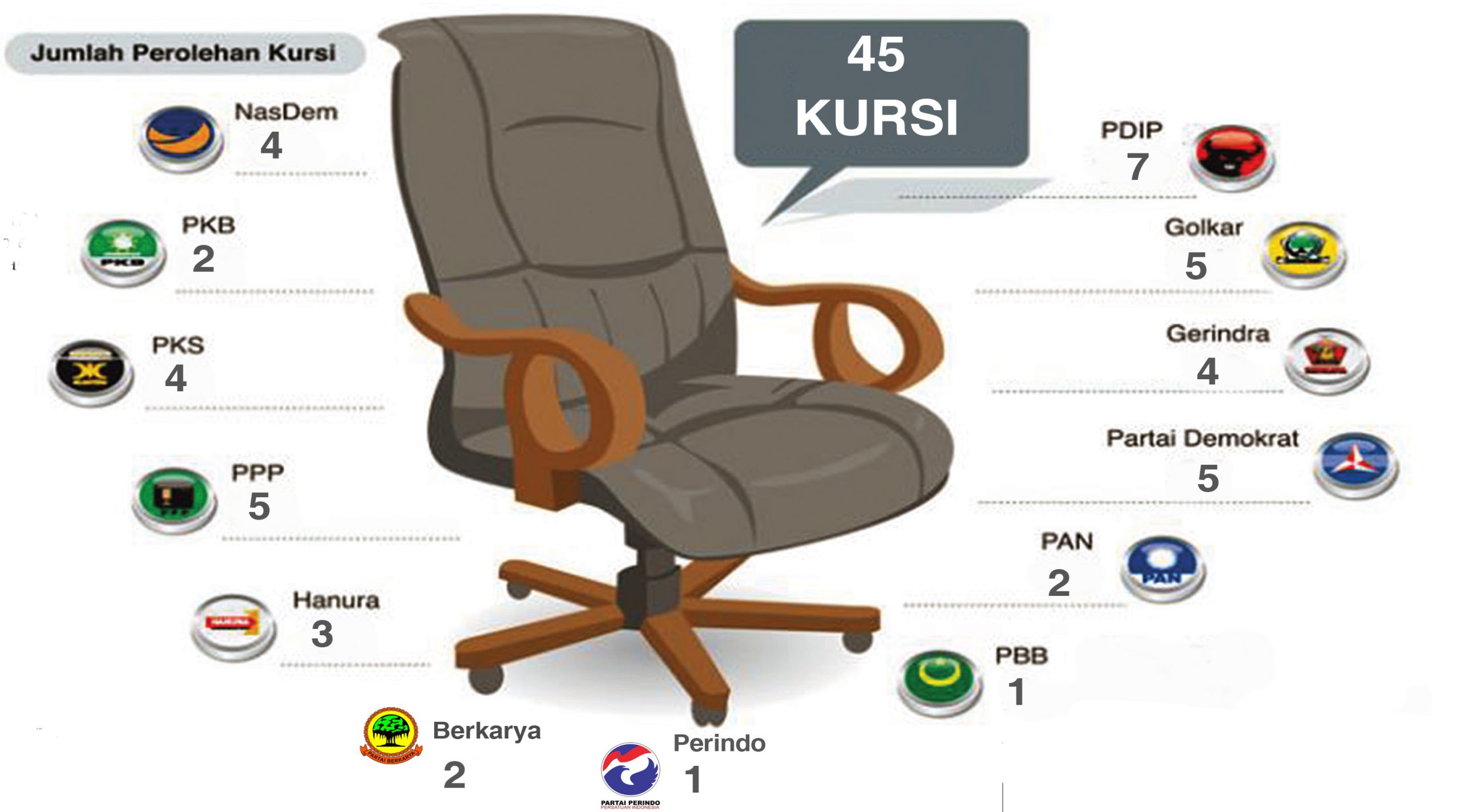 Berdasarkan penetapan caleg terpilih tersebut, adapun perolehan kursi parpol di DPRD Muara Enim yakni PDIP (7 Kursi), Golkar (5 kursi), Demokrat (5 kursi), PPP (5 kursi), PKS (4 kursi), Gerindra (4 kursi), Nasdem (4 kursi), Hanura (3 kursi), Berkarya (2 kursi), PAN (2 kursi) PKB (2 kursi), PBB (1 kursi) dan Perindo (1 kursi).