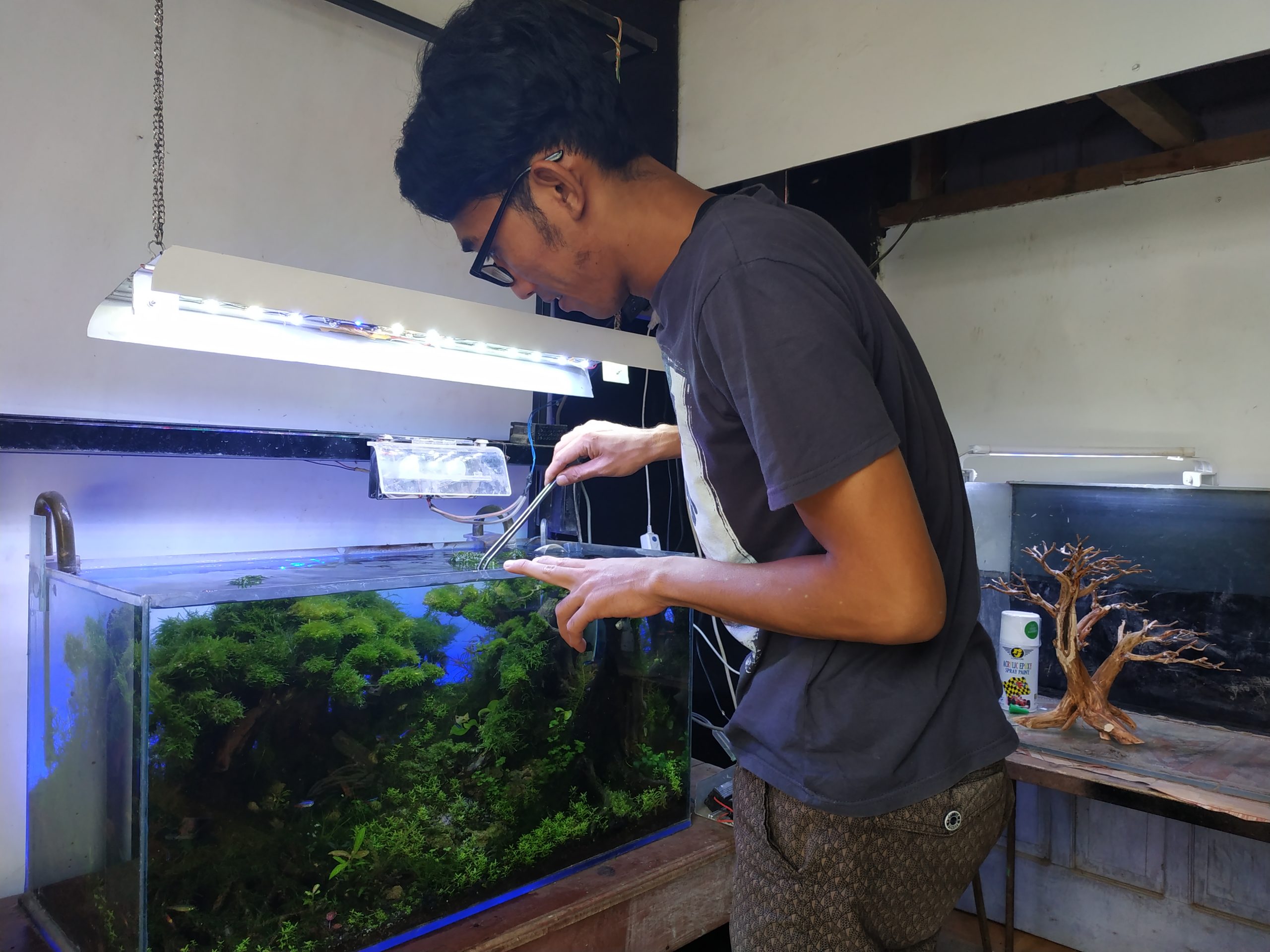 Pria yang akrab disapa Faris ini menjelaskan aquascape adalah seni menata tanaman, kayu, batu di dalam air, sehingga nampak pada alam aslinya. “Aquascape ini saya buat sejak beberapa bulan lalu, masih terus dilakukan perawatan, agar tampak sesuai aslinya di alam,” kata Faris.