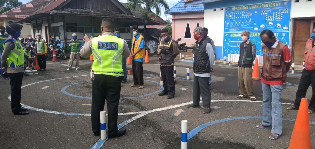 Kalangan sopir angkutan dan tukang ojek ini mendapat penyuluhan tentang tertib berlalu lintas serta pencegahan Covid-19 di lapangan praktek uji SIM Satlantas Polres Muara Enim.