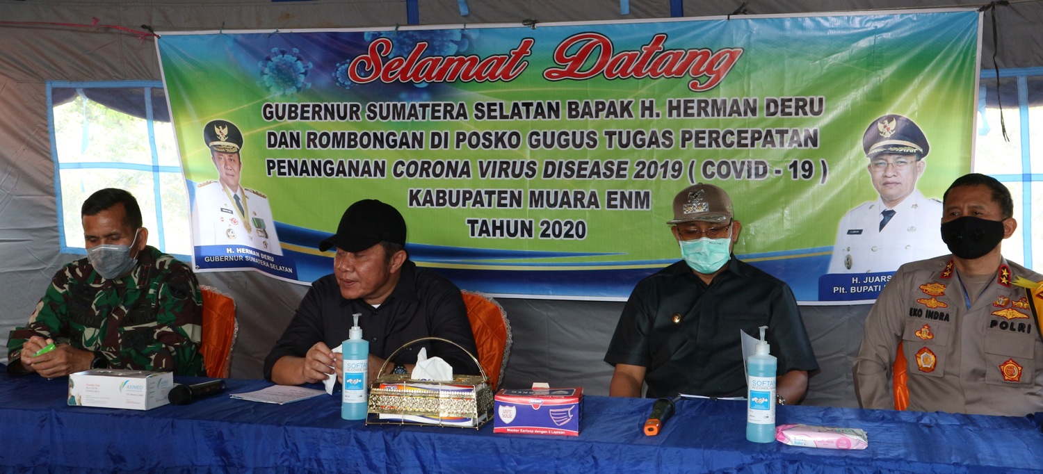 Hal itu dikemukan oleh Plt Bupati Muara Enim H Juarsah SH dihadapan Gubernur Sumsel H Herman Deru, Pangdam II Sriwijaya Mayjen TNI Irwan dan Kapolda Sumsel Irjen Pol Eko Indra Heri saat melakukan kunjungan ke Muara Enim pekan kemarin (2/5) di komplek rumah sehat Islamic Center, guna meninjau kesiapan Pemkab Muara Enim dalam melakukan penanggulangan wabah covid-19 di Bumi Serasan Sekundang. Hadir juga para pejabat Forkominda Muara Enim Kapolres AKBP Donni Eka Syaputra, Kajari Mernawati SH, Wakil Ketua III DPRD Nino Andrian SE, perwakilan PN, Danyonif 141 Letkol Aswin Suladi, Sekda Muara Enim Ir H Hasanudin Msi dan sejumlah kepala OPD Muara Enim.