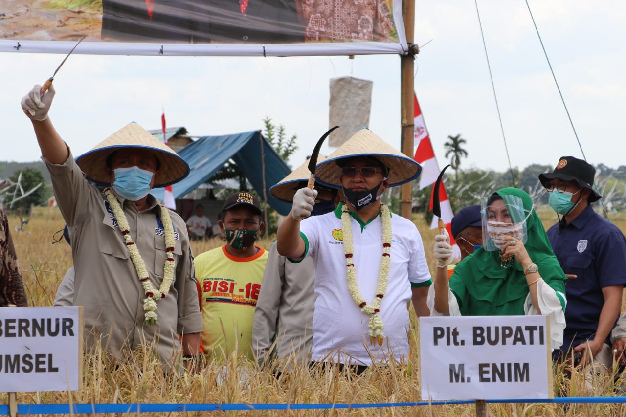 INFOKITO.ID,MUARA ENIM—Guna menjaga ketahanan pangan, Pemerintah Kabupaten Muara Enim menggelar panen raya padi sawah tadah hujan IP 200 (Ume Sele) tahun 2020 bersama warga di Desa Pinang Belarik, Kecamatan Ujan Mas, Kabupaten Muara Enim, Kamis (20/8/2020).