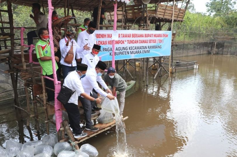 INFOKITO.ID,MUARA ENIM—- Saat mengunjungi Desa Pagar Agung, Kecamatan Rambang dalam kegiatan Bunga Desa Jumat (16/9/2020). Plt.Bupati Muara Enim H Juarsah SH berkesempatan menebar benih ikan di embung desa setempat.kegiatan ini dimaksudkan untuk menjaga keanekaragaman ikan sungai juga untuk membantu perekonomian masyarakat sekitar.